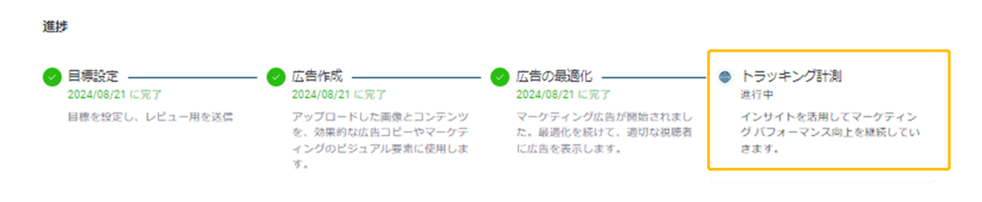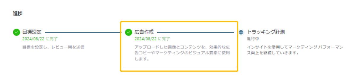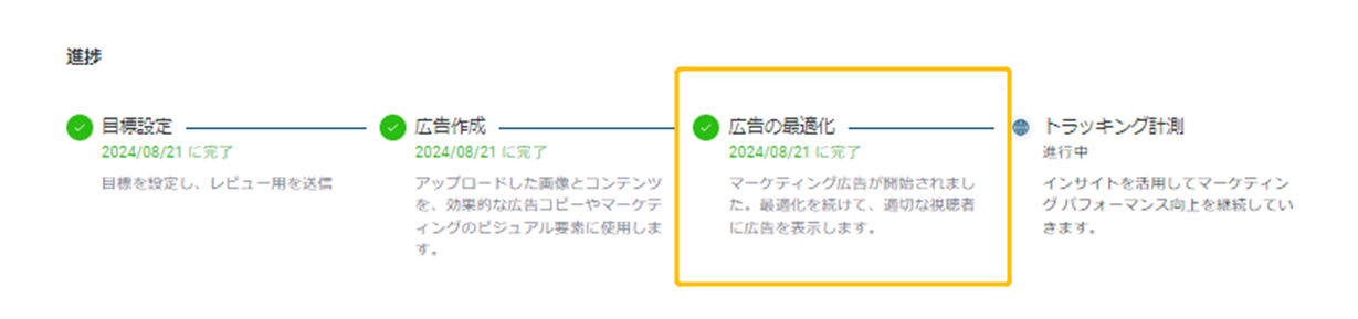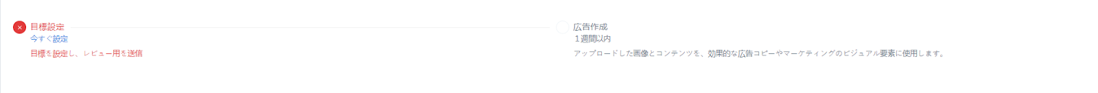 広告作成では、広告の設定状況が表示されます。広告の作成、設定、公開されるまでには約1週間程度かかります。 提供された情報をもとに、広告コピーの作成、キャンペーンの設定、そして自動的な公開をシステムが一括して対応します。 このステップは、目標設定日以降に少なくとも1回のインプレッション(広告が一度でも表示されること)が発生すると完了と見なされます。