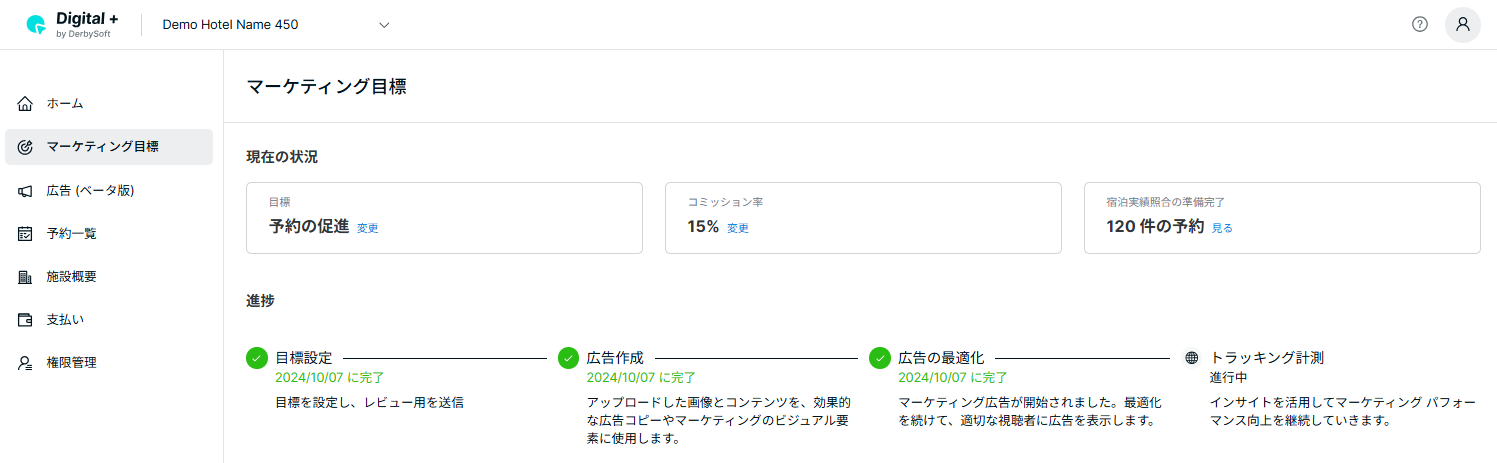 - 施設を登録した際に「後で指定する」を選択した場合、このページには 未設定 と表示されます。これは、まだマーケティング目標が設定されていないことを意味し、機能を有効化するためにできるだけ早く設定してください。